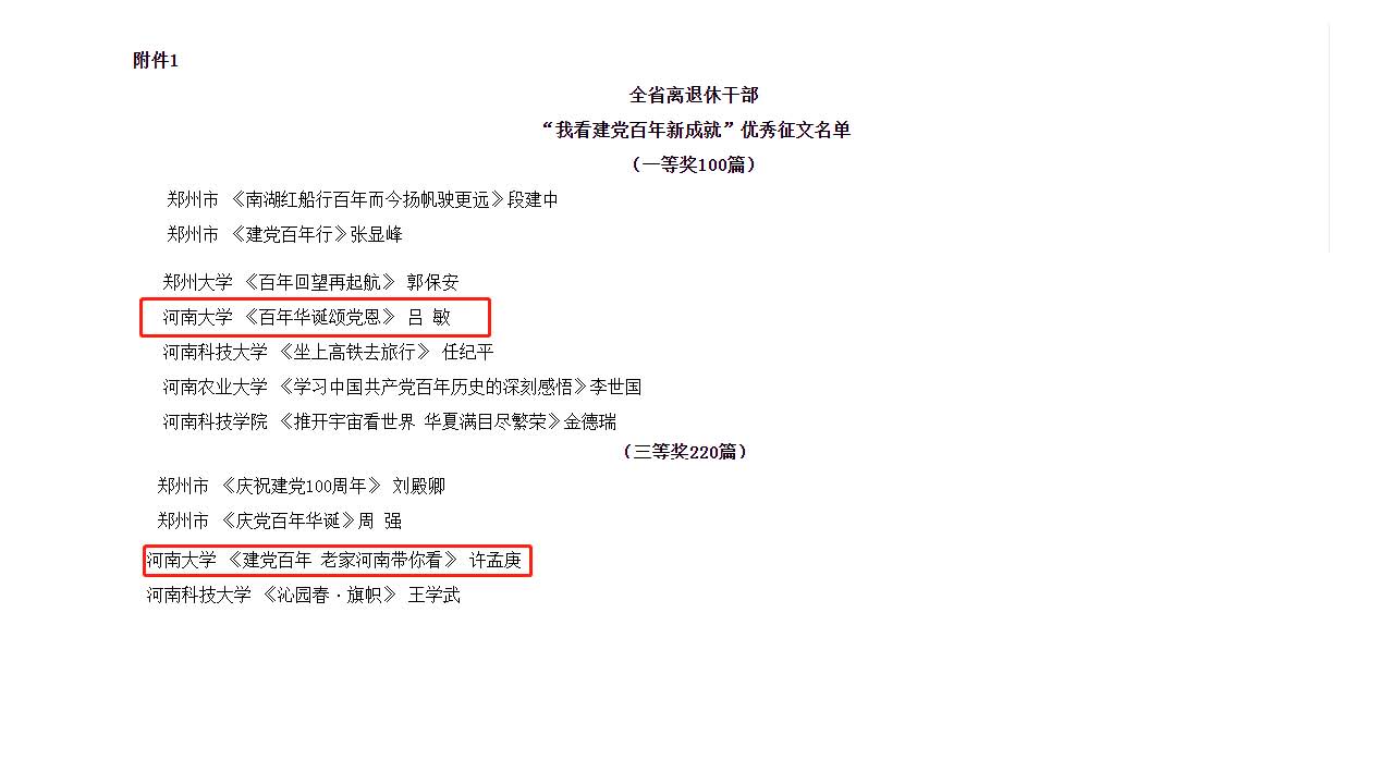 近日,在中共河南省委老干部局举办的“我看建党百年新成就”征文活动中,我校离退休工作处获评“组织工作先进单位”,退休干部吕敏撰写的《百年华诞颂党恩》获评一等奖,许孟庚的《建党百年 老家河南带你看》获评三等奖。