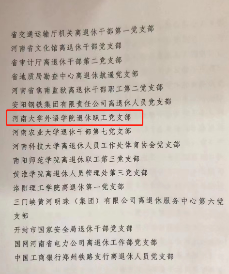 近日,中共河南省委老干部局下发通知,公布了第三批省级示范离退休干部党支部名单。外语学院退休职工党支部经逐级推荐、审核评选,荣获“第三批省级示范离退休干部党支部”称号。