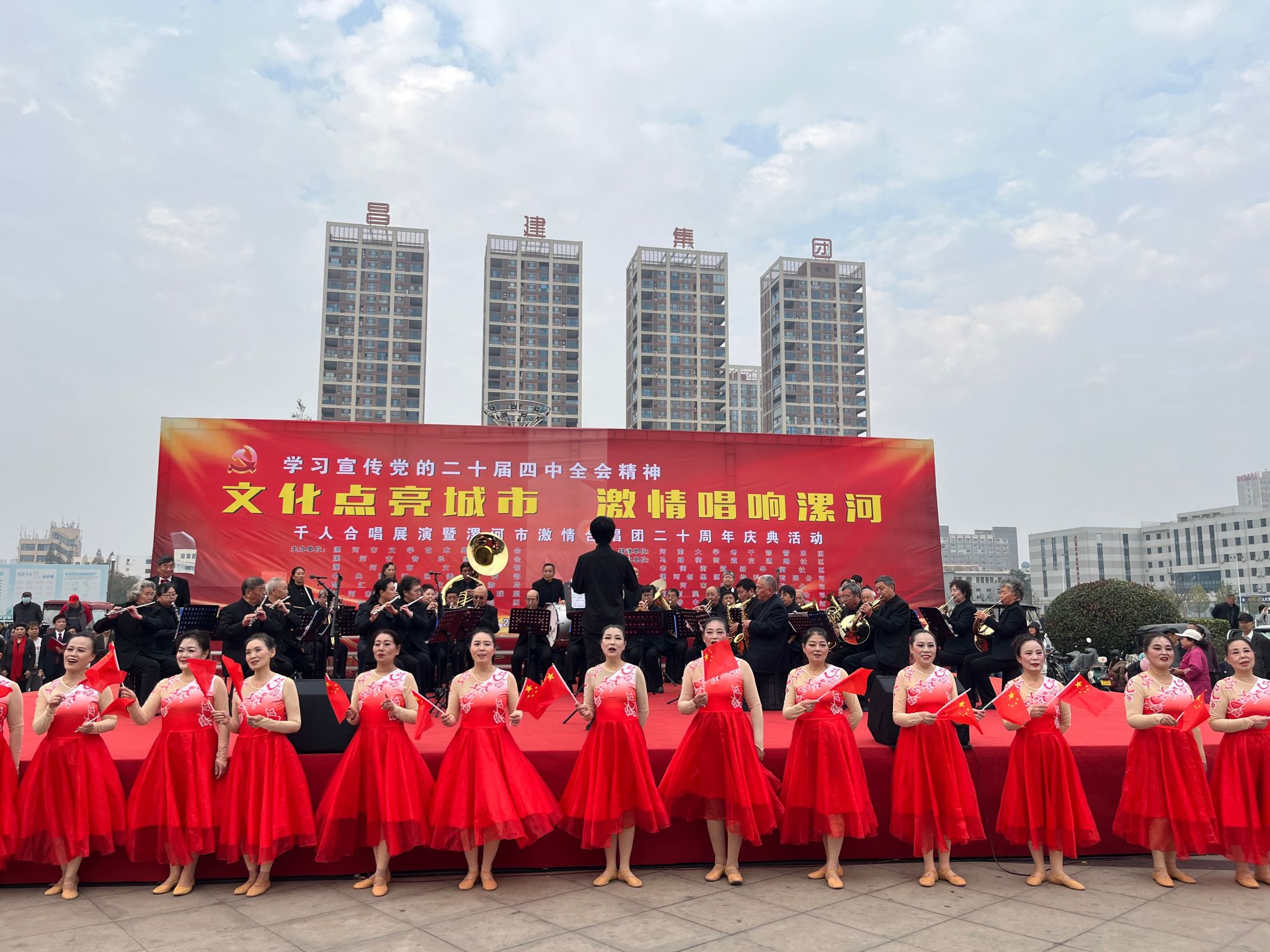 金菊吐艳,丹枫似火,11月16日,我校老干部管乐团再次受邀,来到沙澧河畔的活力之城漯河,参加“文化点亮城市 激情唱响漯河”千人合唱展演暨漯河市激情合唱团二十周年庆典活动。本次活动由中共漯河市委宣传部指导,漯河市文学艺术界联合会等单位主办,漯河市激情合唱团承办。漯河市文联党组书记、主席陈向丽等参加活动,河南大学原副校长王发曾,离退休党委书记、离退休工作处处长牛林豪应邀出席。