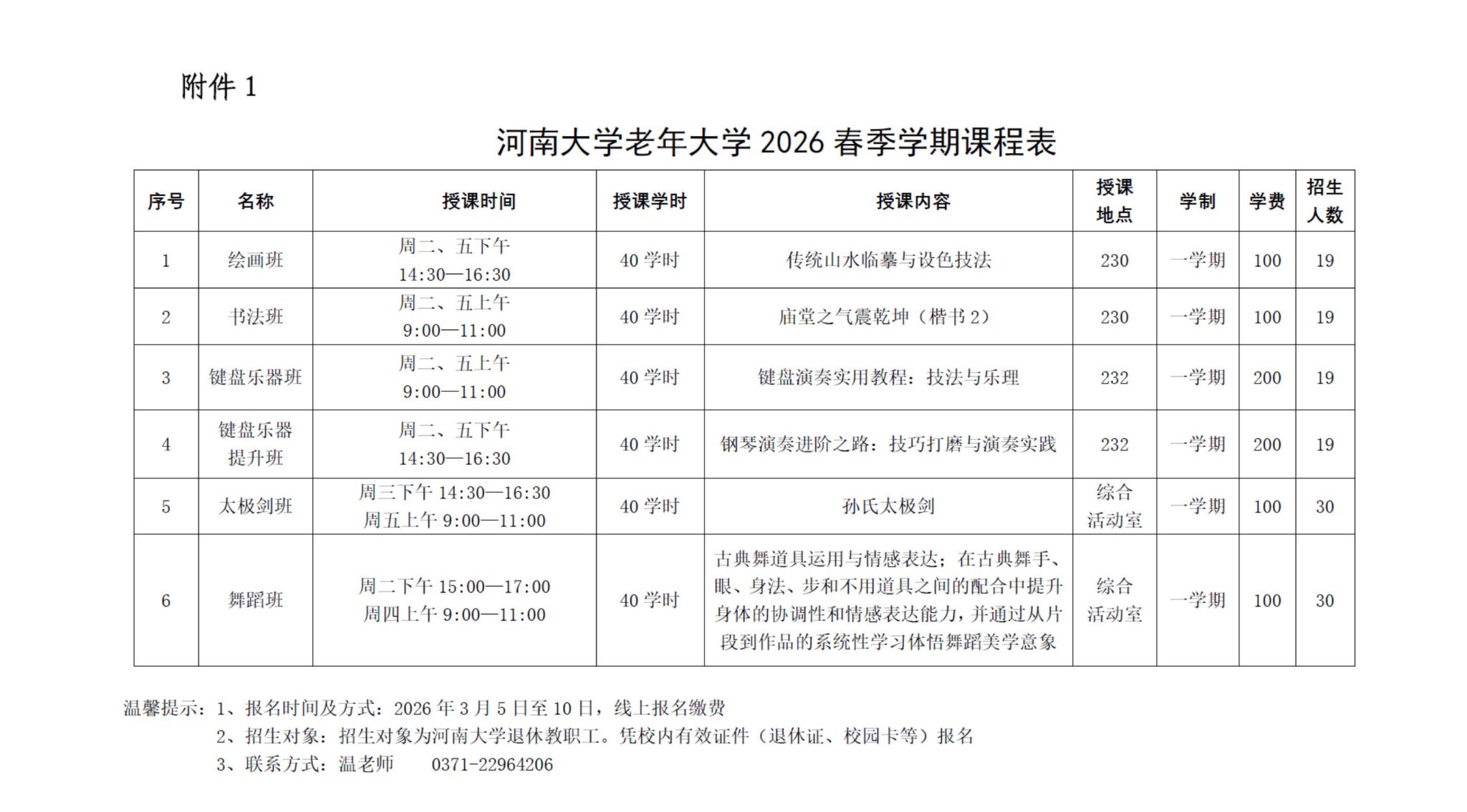 河南大学老年大学创立于1988年,是一所多学科、多层次的综合性老年大学,是河南省老干部大学的分校。2026年春季学期拟开设书法、绘画、太极剑、键盘乐器、舞蹈等5个专业,6个教学班。